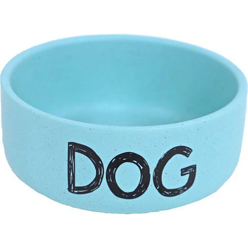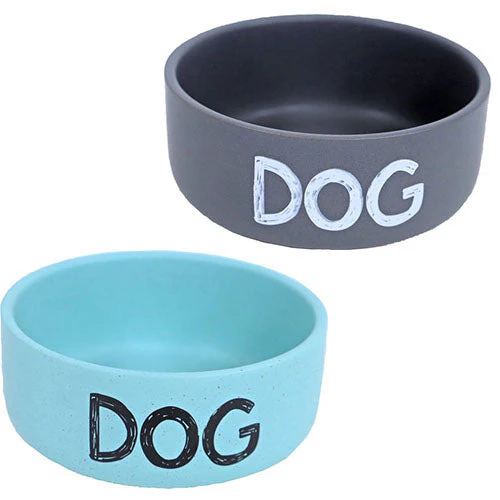 Boon honden eetbak aardewerk mat grijs of lichtblauw met DOG erop.