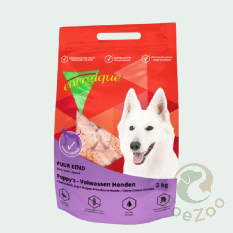 Tegenwoordig komen voedselallergieën en -intoleranties tamelijk veel voor bij honden. Energique Puur Eend is speciaal samengesteld voor honden die overgevoelig reageren op voeding. Uit onderzoek is namelijk gebleken dat de meeste voedingsreacties ontstaan op ingrediënten die veel in diervoeding gebruikt worden, zoals bijvoorbeeld rund, kip of tarwe. In Energique eend is geen gebruik gemaakt van deze ingrediënten. De kans dat een reactie ontstaat op deze voeding is dus een stuk kleiner. Energique Puur Eend is speciaal ontwikkeld in samenwerking met dierenartsen. Als enige dierlijke eiwitbron is gebruik gemaakt van eendenvlees, een vleessoort waar weinig honden gevoelig op reageren. Ook voor de plantaardige eiwitbronnen is alleen gebruik gemaakt van ingrediënten waarvan bekend is dat de kans op een overgeveligheidsreactie heel klein is zoals o.a. wortel en spinazie.