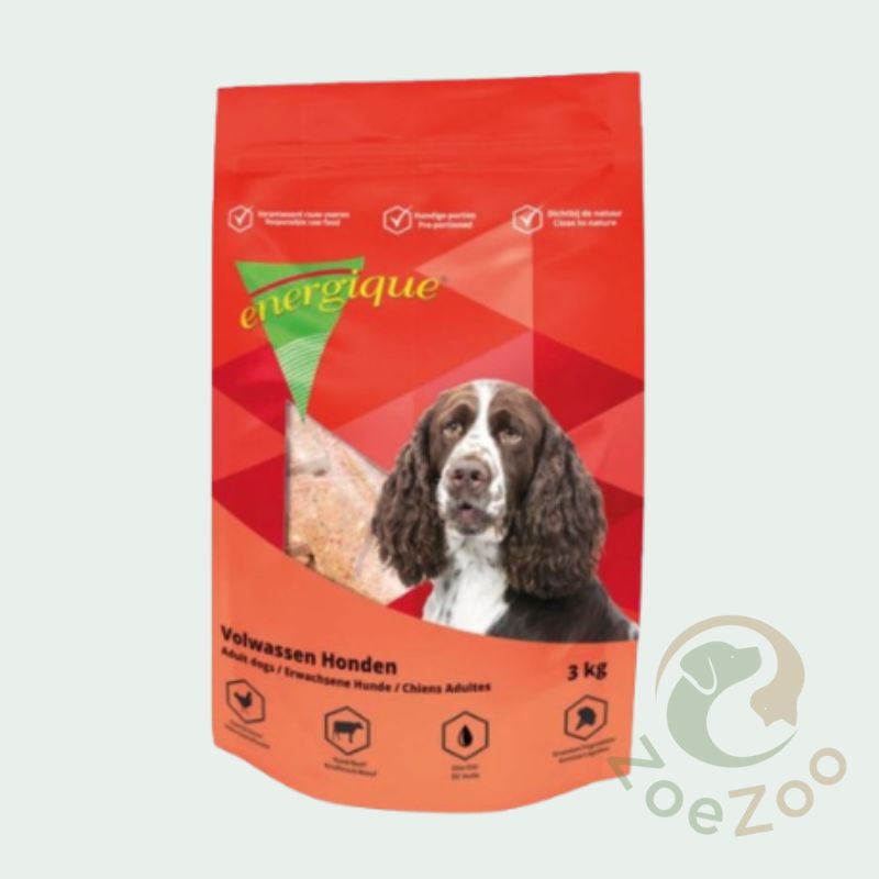 Energique Volwassen Honden is een complete vers vleesmaaltijd samengesteld voor volwassen honden. De maaltijd is zo samengesteld om te voorzien in de natuurlijke voedingsbehoeften van de hond. Energique maakt gebruik van kwalitatief hoogwaardige vleesbronnen. In deze variant is gebruik gemaakt van kip en rund. Energique Volwassen honden is goed verteerbaar en met toevoeging van vezels uit dierlijke én plantaardige bron ondersteund een gezonde darmwerking en stevige ontlasting. Zonnebloem- en zalmolie leveren de benodigde essentiële vetzuren voor een gezonde huid en vacht.