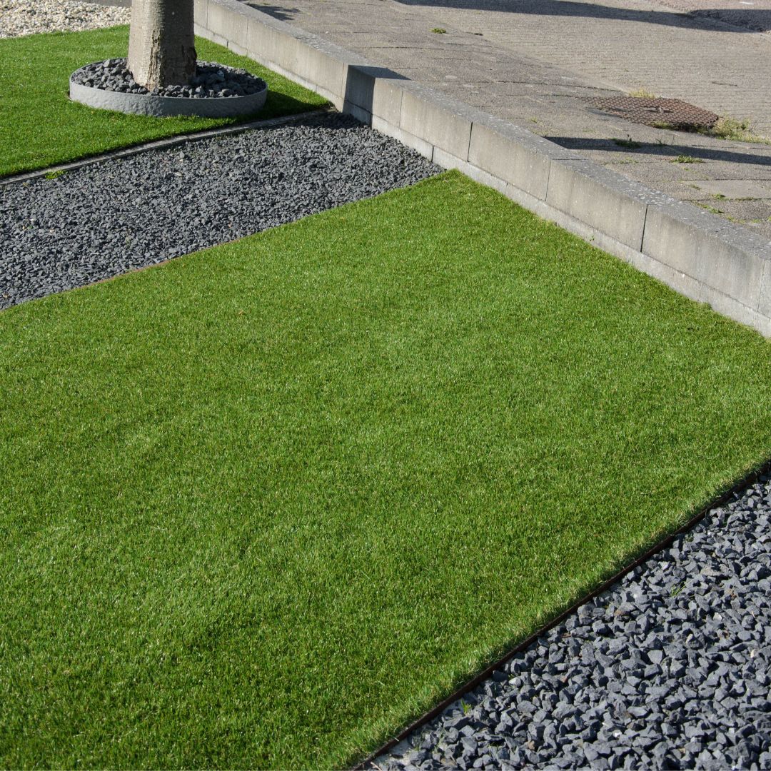 Lijmband: Is de tuin te breed en is de kunstgrasrol daarmee te smal, dan is het mogelijk om met lijmband verschillende stukken kunstgras aan elkaar verlijmen. Let op – voor het mooiste resultaat kan dit eigenlijk alleen aan de rechte zijkanten gebeuren en dus niet aan de kopse kanten. Denk er ook aan dat het gras wel in de zelfde richting moet liggen, in vorm met de vleug.