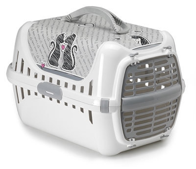 Laat jouw kat prettig reizen met de Trendy Cat Cats in Love transportbox. De moderne transportbox heeft een leuk, trendy design met romantische teksten en leuke afbeeldingen van verliefde katten.